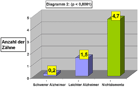 Zusammenfassung: Schwere Alzheimerpatienten haben 20 mal weniger Zähne als gleichaltrige Nichtdemente (0,2 versus 4,7 Zähne pro Patient, p<0,0001). Zahnlosigkeit ist somit ein eigenständiger Risikofaktor für die Entwicklung einer Alzheimerdemenz. Möglicherweise sind die noch erhaltenen Zähne der Nichtdementen eine Art „Langzeitgedächtnis“ für eine lebenslange gesündere Ernährungsweise, die eventuell vor Alzheimer schützt.