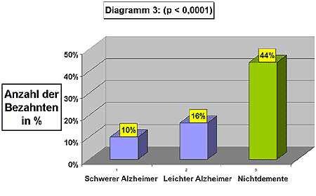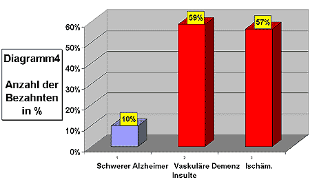 Diskussion: Die Ergebnisse zeigen, daß Zahnlosigkeit ein eigenständiger, vom Alter unabhängiger Risikofaktor für die Entstehung einer Alzheimerdemenz ist. Da der Zusammenhang von zuckerreicher Ernährung und Zahnkaries wissenschaftlich gesichert ist, ist dies möglicherweise ein Hinweis darauf, daß eine zuckerreiche Ernährung eine Mitursache bei der Entstehung der Alzheimerdemenz ist. Auffällig ist weiterhin, daß ausgerechnet die vaskulären Demenzen und ischämischen Insulte wesentlich seltener mit Zahnlosigkeit einhergehen.
